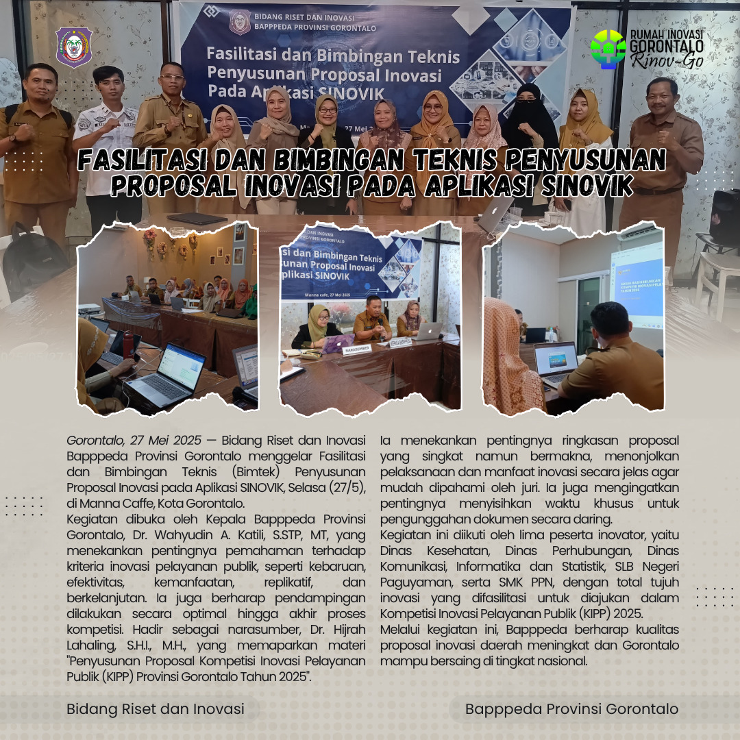 Kegiatan tersebut dibuka secara langsung oleh Kepala Bapppeda Provinsi Gorontalo, Wahyudin A. Katili, dan diikuti oleh 19 inovator dari berbagai perangkat daerah Provinsi Gorontalo, yang telah memenuhi seluruh indikator penilaian Innovative Government Award (IGA) Tahun 2025 dan Kompetisi Inovasi Pelayanan Publik (KIPP) Tahun 2025.
